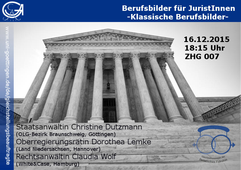Hierbei handelt es sich um eine Vortragsreihe, die jungen Juristinnen und Juristen Berufsmöglichkeiten und Wege, um diese zu erreichen, vorstellen soll. Dabei werden durch Erfahrungsberichte und Vorträge ganz unterschiedliche juristische Berufe aufgezeigt.